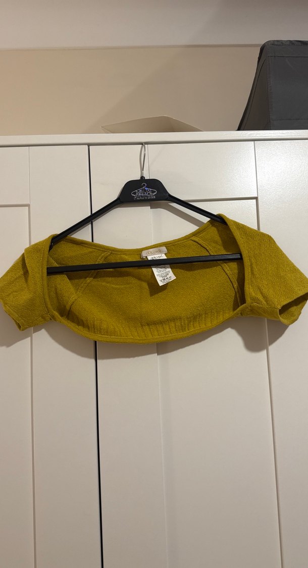 Bu hardal kadın bolero, kısa kollu ve yün dokusuyla rahat bir kullanım sunar. Normal midi boyunda ve sade desensizdir, günlük kullanıma uygundur.