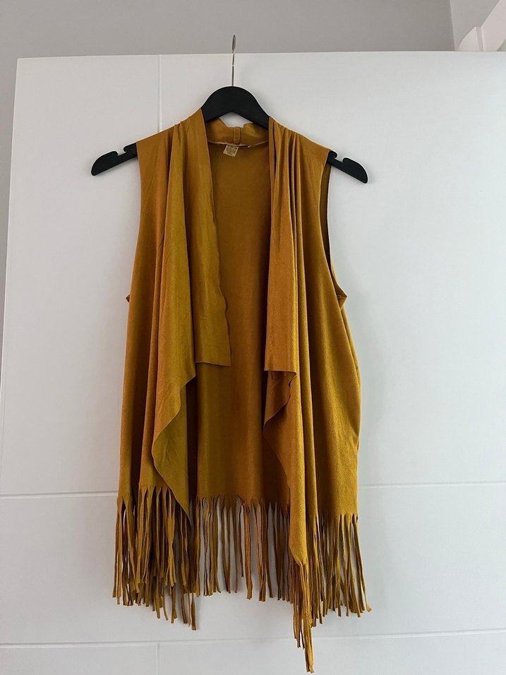 Hardal süet, kolsuz, drapeli ve püsküllü bohem yelek. Salaş kesim ve straplez yakaya sahip, tie-dye desenli rahat bir parça.