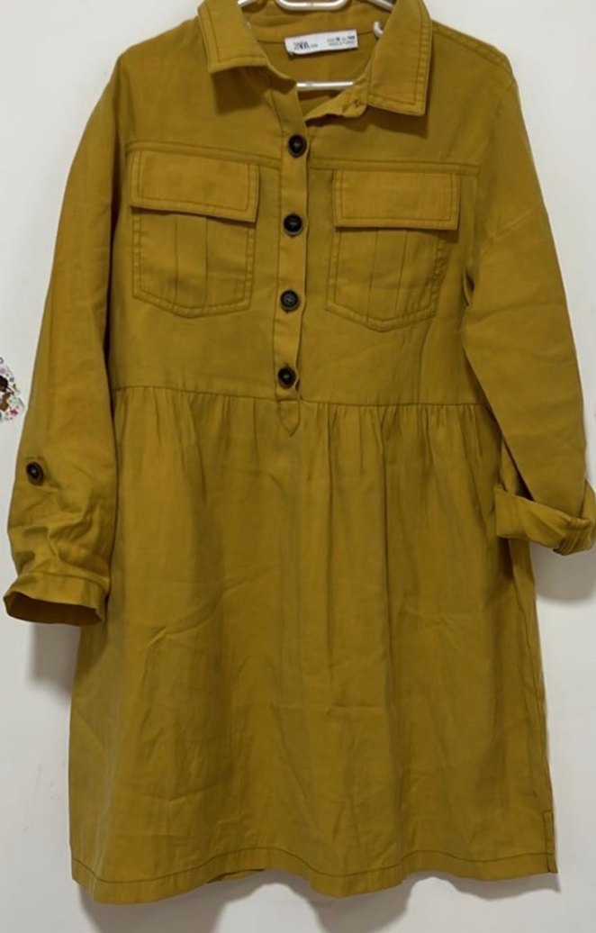 Hardal tensel kumaştan yapılmış, düğmeli, uzun kollu, yaka detaylı, cepli ve bol kesim uzun elbise. Günlük sokak stili için uygun.boyu:72 cm