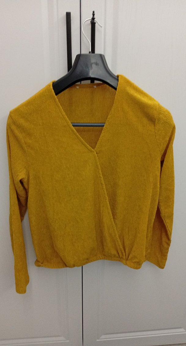 hardal renkli, V yakalı ve uzun kollu triko kazak. Keten kumaştan üretilmiş, rahat ve günlük kullanıma uygun bol kesim bir modeldir.