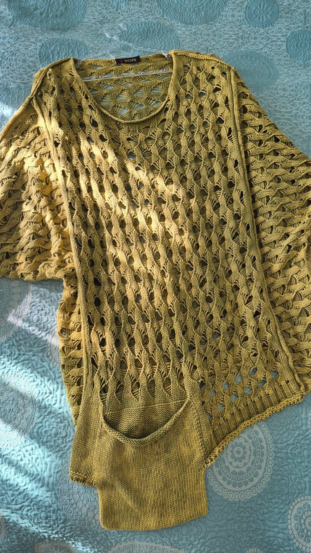 Bohem tarzda,hardal/zeytin yeşili renkli, uzun yarasa kollu, asimetrik örgü kadın kazak. Rahat kesim, midi boy ve küçük cepli, günlük kullanıma uygun. Cep asimetrik görünüm veriyor. Etiket yok fakat hiç giyilmedi. Uygun bedenler L- 2XL Esnek olsa bile daha büyük bedenlerde salaş yerine tam oturmuş durabilir.