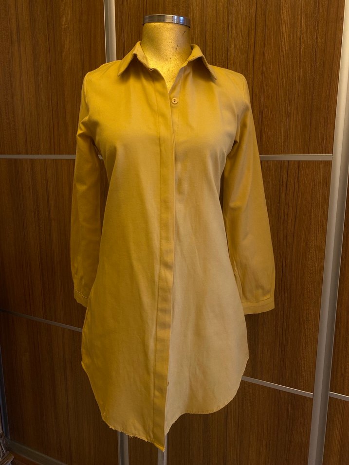 Hardal renkli kadın midi gömlek, uzun kollu ve yakalıdır. Düğmeli tasarımı ve sade görünümü günlük rahat kullanım için uygundur. Sentetik kumaştan üretilmiştir. Alt kısımda küçük defo vardır ama belli oluyor tesettüre uygundur