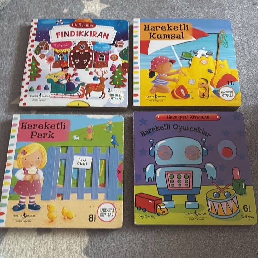 Fındıkkıran, Kumsal, Park ve Oyuncaklar temalı dört hareketli çocuk kitabı seti. Her kitapta hareketli bölümler bulunur. adet fiyatı 120