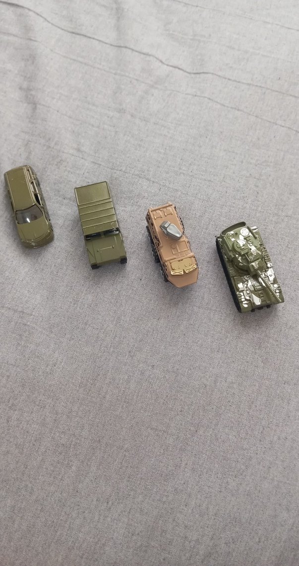 Yeşil renkte dört mini askeri oyuncak araba seti.