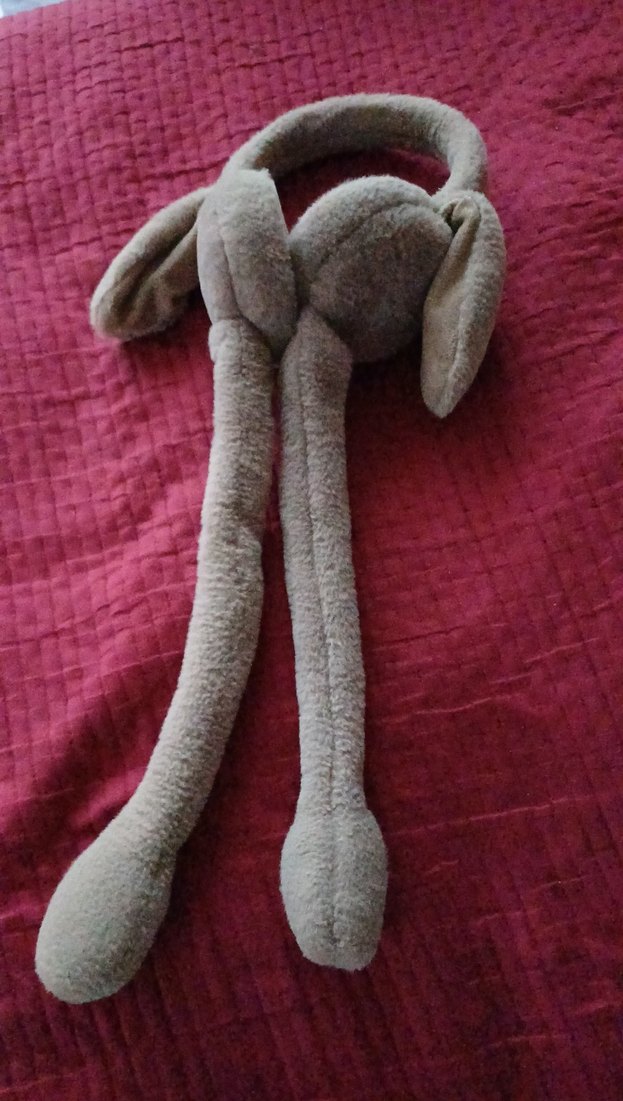 Gri renkte, uzun kulaklı ve ekstra uzun bacaklara sahip yumuşak peluş oyuncak. kahverengi hareketli kulaklik