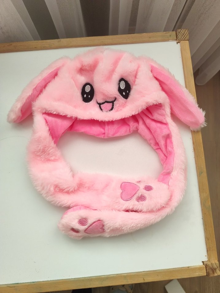 Pastel pembe renkli, ışıklı,yumuşak peluş kumaştan yapılmış çocuk bere. Nakışlı gözler ve gülen yüzü, uzun kulakları ve pati detaylarıyla şirin ve sıcak bir tasarım sunar.