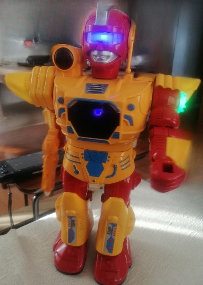 Alıcısına hayırlı olsun. Diğer ilanlarımı inceleyiniz. Ürün Açıklaması : DefaToys Hareketli Yürüyen Işıklı Sesli Savaşçı Robot Adam Oyuncak * Elleri, gövdesi, kafası hareketlidir. * Işıklı * Sesli * Yürüyen robot adam * Kalem pil ile çalışır. * Kırığı çıkığı yoktur. * Muhtelif çizikleri olup genel kozmetiği iyi durumdadır. * Boyu yaklaşık 33 cm. * Fotoğraflarda görüldüğü şekilde gönderilecektir.