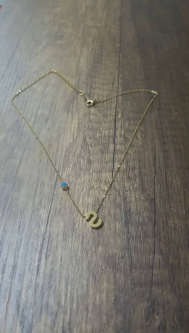 Minimalist ve bohem tarzda, harf figürlü ve küçük mavi boncuklu uzun altın zincir kolye, günlük kullanım için uygun. 25 cm çelik