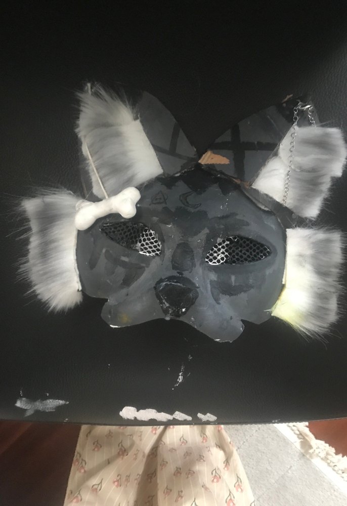 Kedi aksesuarları için beyaz tüy detaylı, file gözlüklü koyu gri kedi maskesi.