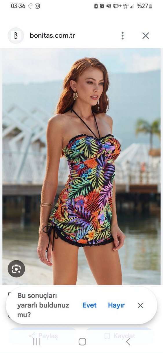 Göğüs kısmında ince sabit olmayan sünger mevcuttur.Boyundan bağlamalı mayonun,göğüs kısmıyla alt slibini,birbirine bağlayan korse astar mevcuttur.Eteğin yan kısımlarında büzgü aksesuar vardır. Içi delikli file gibi. Cabuk kurumasını sağlıyor. Renkleri durusu harika. ipleri ile etek boyunu büzerek yukarı aşağı ayarlanabilir. Boyundaki ipi ile ister straplez ister boyundan bağlı kullanabilirsiniz. omuz izi yapmaması için farklı kullanım kolaylık. Göğüs kismi sıkı ,asla suda gevşeyip inme gibi bir durumu olmadi. Cok severek dönüşümlü kullandim. Hala ilk günkü kadar temiz ve yeni.. #pierrecardin #eteklimayo #elbisemayo #mayo #44beden #buyukbeden Drapeli, çok renkli tropikal yaprak desenli, mini ve ince askılı, vücuda oturan mayo, plaj için uygundur. ️