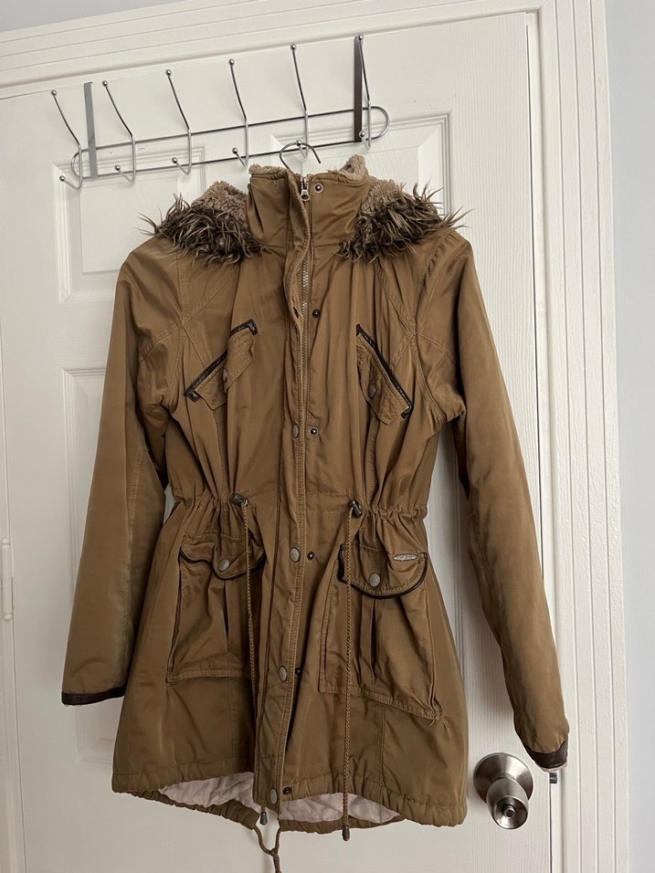 • Renk: Haki/açık kahverengi • Özellikler: Kapüşonlu, kürk detaylı yaka, belden ayarlanabilir büzgü (fit kesim için), bol cepli ve fermuarlı/çıtçıtlı kapama. • Stil: Hem spor hem de şık kombinlere uygun, sıcak tutan ve trend bir model. • İdeal: Soğuk havalar için mükemmel bir koruma sağlar.