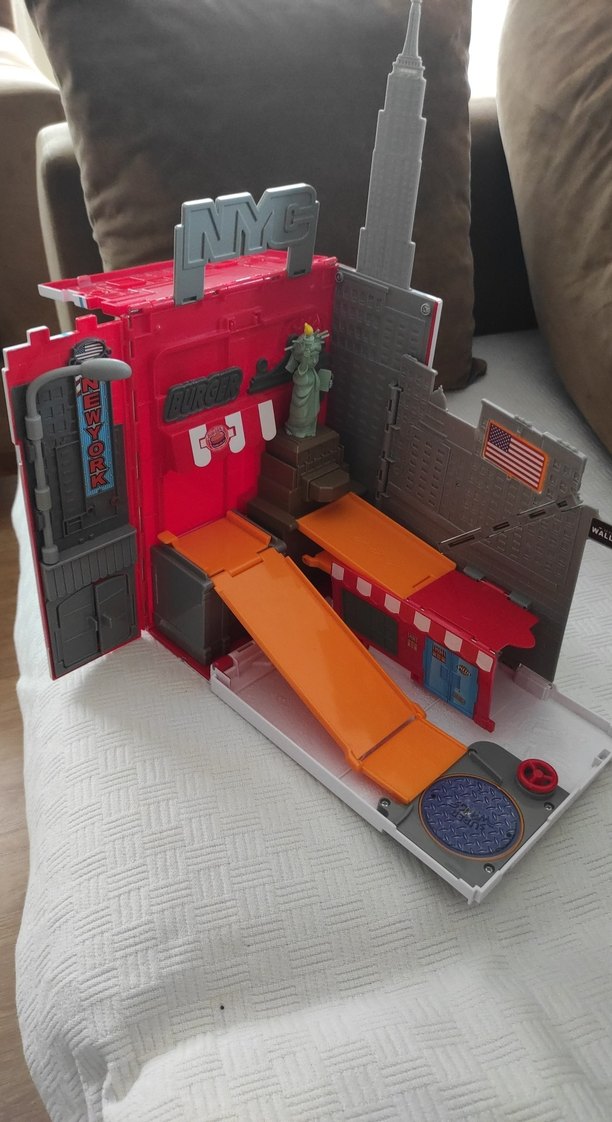 Koyu kırmızı renkte, Özgürlük Heykeli, burger dükkânı ve rampa içeren detaylı Hotwheels New York şehir manzarası model seti.