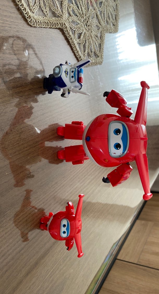 Kırmızı renkte büyük ve küçük uçak figürleri ile mavi beyaz robot figüründen oluşan renkli aksiyon figürleri seti. ✈️
