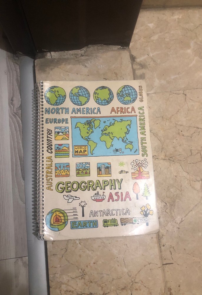Bej renkli spiralli defter, Kuzey Amerika, Afrika, Avrupa, Asya, Antarktika ve Avustralya kıtalarını gösteren renkli harita ve coğrafya temalı çizimler içerir.