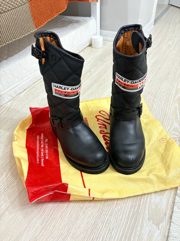 Siyah tokalı ve yüksek topuklu kauçuk biker botlar. Kapitone üst kısmı ve Harley-Davidson logosu ile sokak modasına uygun rock punk havası taşıyor. Önde hafif soyulmalar dışında problemi yoktur