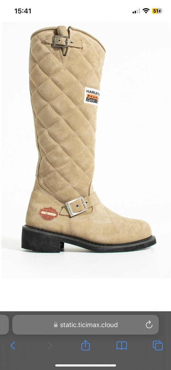 Bej süet malzemeden, tokalı ve blok topuklu dizüstü biker tarzı kadın çizmesi, günlük kullanıma uygundur.