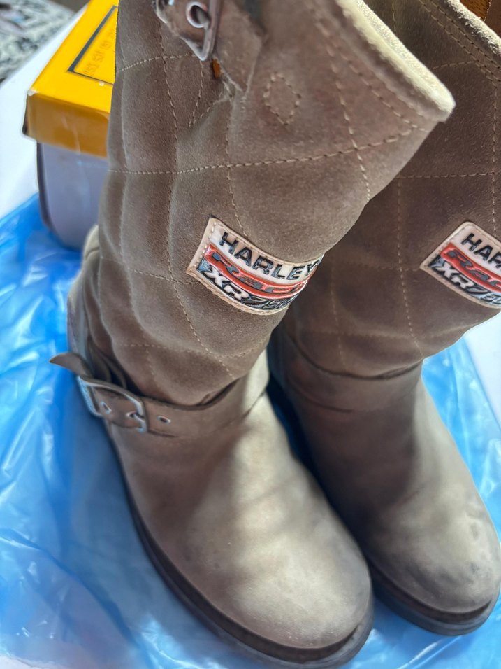 Kahverengi süet biker botlar, yüksek topuk ve tokalı detaylara sahiptir. Trendy rahat sokak stiline uygundur ve baskılı Harley etiketi bulunur. önlerinde renk değişimi mevcut sorunu yok Silince geçebilir aynı şekilde Kullanıma bağlı önünde katlanma mevcut Kullanıma engel değildir herhangi bir yırtı söküğü bulunmamaktadır orijinal ürün.