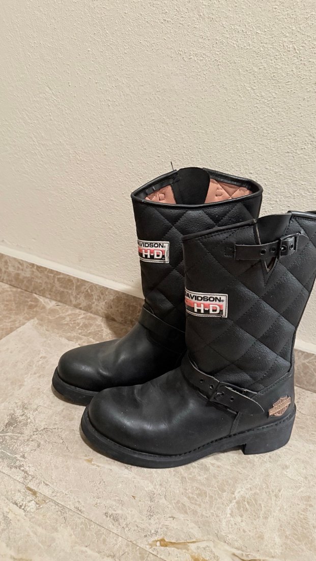 Siyah deri biker botları, blok topuklu ve tokalı, kapitone desenli, sadece 4-5 kez kullanıldı. Hiçbir deformesi yok dolapta durduğu için önünde katlanma olmuş ama giyince düzeliyor. Orjinaldir.