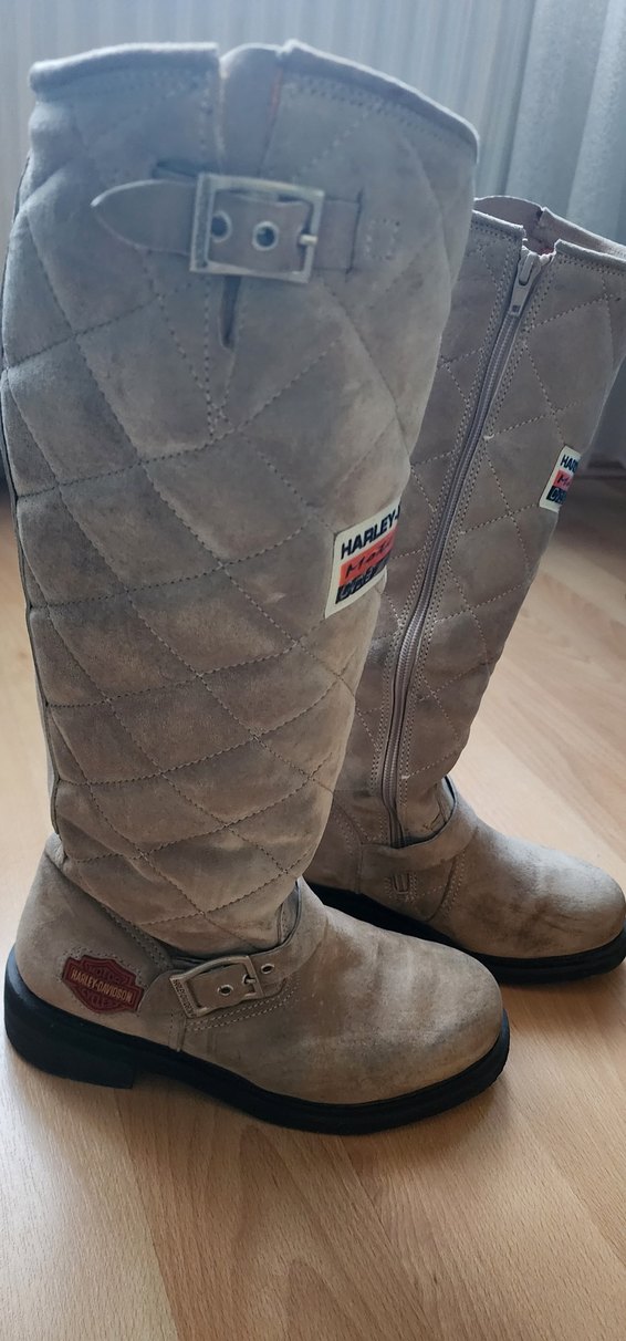 Kadınlar için gri süet, tokalı ve dizüstü biker çizme. Rahat ve günlük kullanıma uygun, yan fermuarlı ve kapitone detaylı.Bi tanesinin kenarında hafif leke var bu yüzden uygun fiyata veriyorum