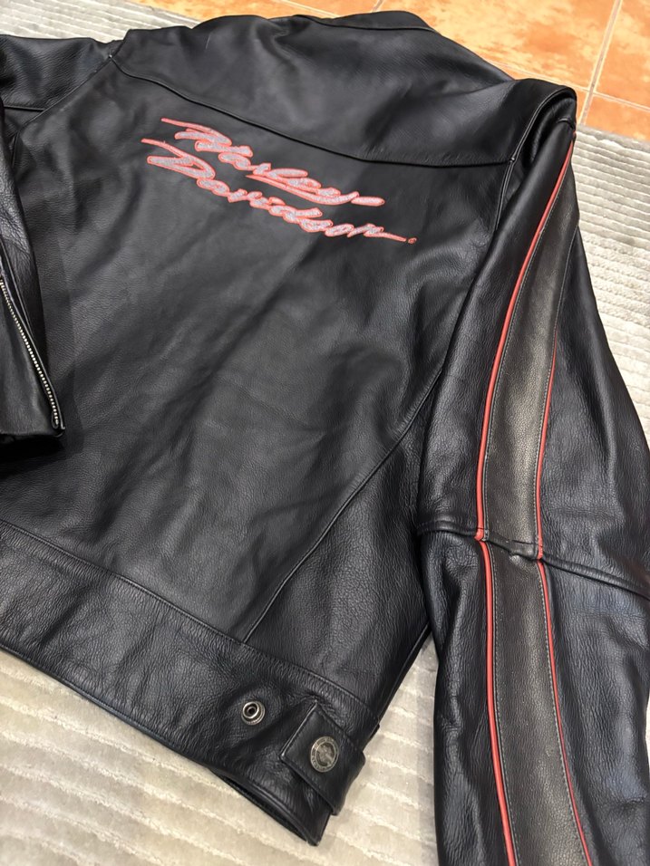 Deri siyah Harley biker ceket, uzun kollu ve kesik yaka detaylıdır. Fermuarlı ve baskılı tasarımıyla sokak stiline uygundur.