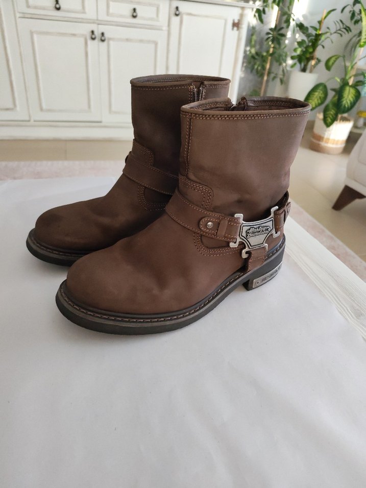 Harley. Davidson Erkek Kahverengi deri, yüksek topuklu, tokalı biker bot. Düz desensiz, sokak stiline uygun, günlük kullanıma uygun. Herhangi bir defosu yoktur