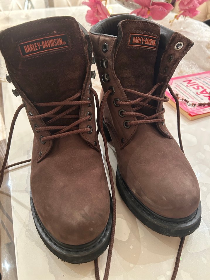 Harley-Davidson marka, koyu kahverengi deri biker botlar, yüksek topuklu ve tokalı detaylara sahiptir, günlük kullanım için uygundur. ️herhangi deforme yıpranma yoktur fazla kullanılmadı tertemiz