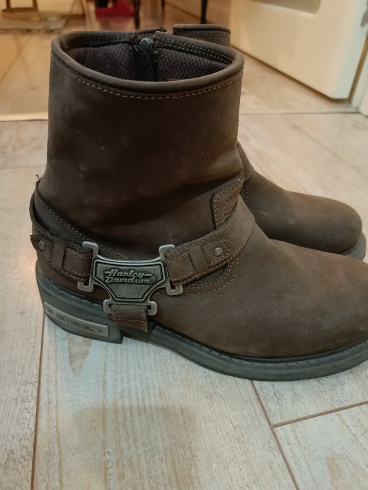 Kahverengi deri biker bot, tokalı detay ve blok topuklu. Üzerinde Harley Davidson metal logosu bulunur. Günlük kullanıma uygun, desensiz.
