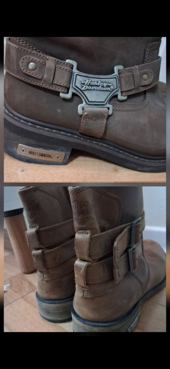 Harley Davidson markalı, kahverengi deri, tokalı biker tarzı erkek bot. Sokak stiline uygun sağlam tasarım. alt taban ahşaptır çok tarz duruşu var