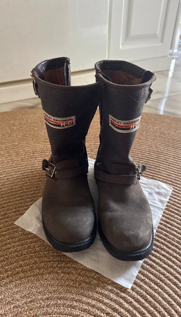 Kahverengi deri çocuk botları, tokalı kayışlara ve dayanıklı yapıya sahiptir. Desensiz yüzey ve sağlam tasarım sunar. ️harley davidson