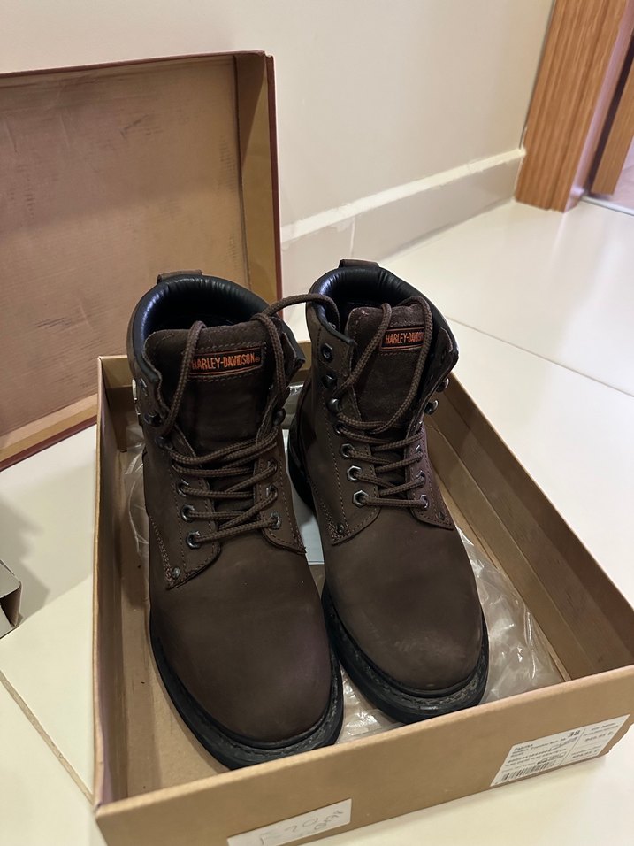 Harley-Davidson markalı, tokalı detaylara sahip koyu kahverengi süet biker botlar, günlük rahat kullanım için uygun. Çok az giyildi temiz durumda, herhangi bir deformasyon yok. 39 numara tam beden alabilirsiniz
