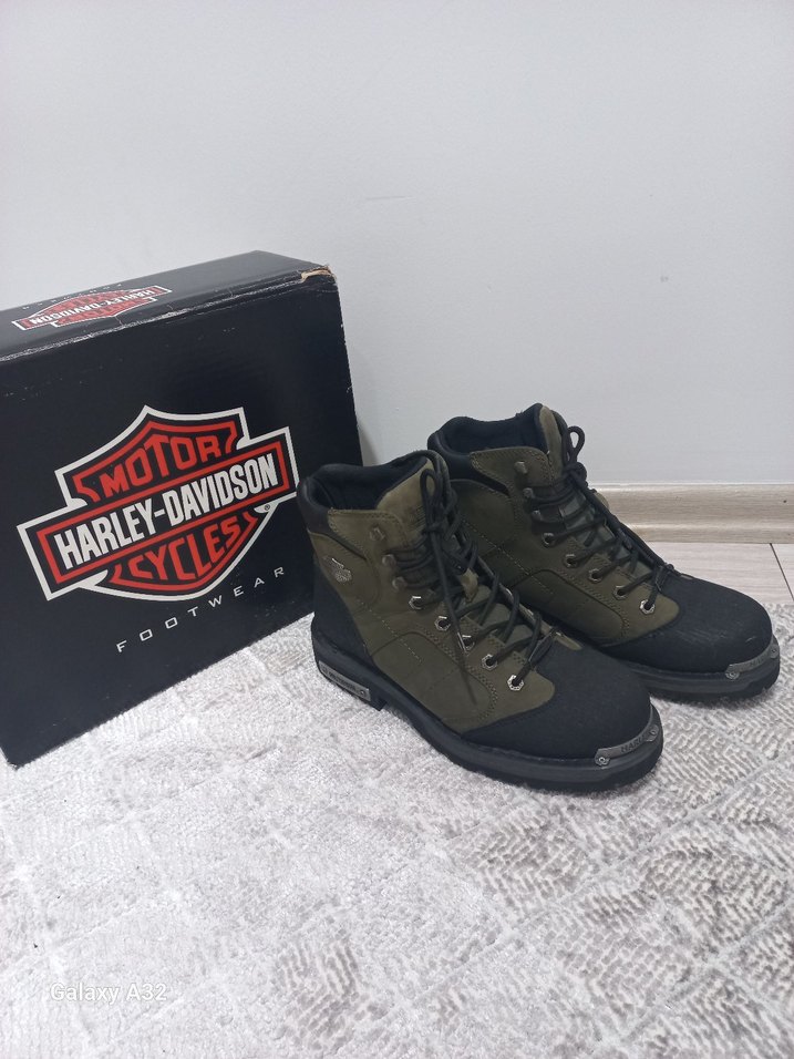 Harley-Davidson erkek botları, koyu yeşil kamuflaj deseni, kauçuk malzeme ve kemerli tasarıma sahip, günlük sokak stili için uygundur.