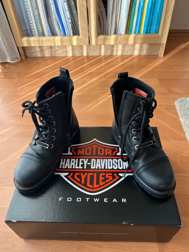 Yüksek topuklu, tokalı siyah deri biker botlar, rock punk havası taşıyor. Kutulu Harley-Davidson, az giyildi.