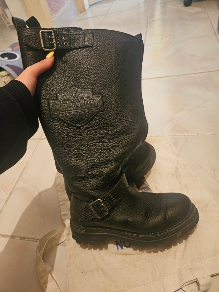 harley davidson Siyah Deri Biker Bot, Tokalı, Yüksek Topuklu