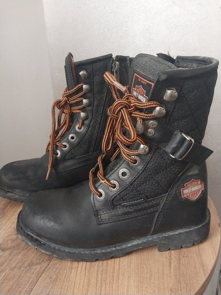 Harley Davidson logosu ve bağcıklarıyla siyah deri biker botlar, yüksek topuklu ve tokalı. Grunge punk tarzına uygun. cok az kullanildi hicbir sorunu yoktur