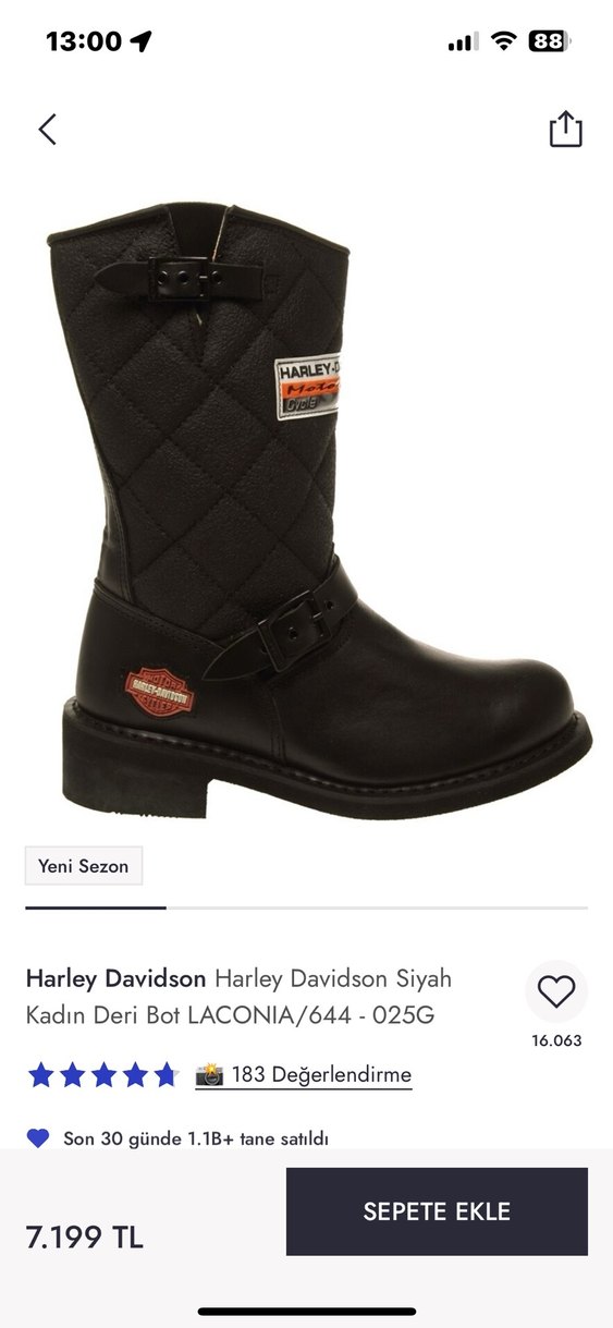 8 9 kere anca giyildi, 0 a çok yakın durumda çok kaliteli ve sapasağlamdır detaylar fotoğraflarda mevcuttur Siyah deri kız biker bot, tokalı kayışlar ve kapitone üst detaylıdır. Harley Davidson kalitesiyle dayanıklı ve şık. Orhjinaldir. Boynerden alındı