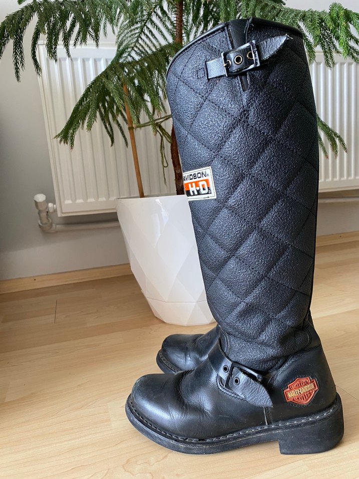 Kemer detaylı, topuklu siyah dizüstü biker botlar, dokulu kauçuk malzemeden, sokak stiline uygun rock punk havasında. 1080 gr, diz altı, yandan fermuarlı. Topuk boyu 3 cm, alçak-kısa topuk. Bilek uzunluğu 40 cm. Zamanında çok kullandım bu nedenle kullanıma bağlı olarak eğrilme var. Ayağınıza giydiğinizde bu eğrilik azalıyor. Görsellerde görebilirsiniz. Çok dayanıklı, kışın çok kullanışlı. Sıcak tutuyor. Ben artık daha klasik çizme sevdiğim için satıyorum. Gönderilmeden önce temizlenecektir. #harleydavidson #kış #bot #çizme #siyah
