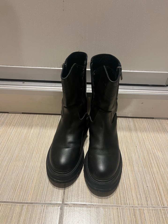 Siyah kauçuk kadın botları, platform topuklu ve tokalı detaylara sahip, minimalist gotik tarzda, günlük kullanıma uygun.