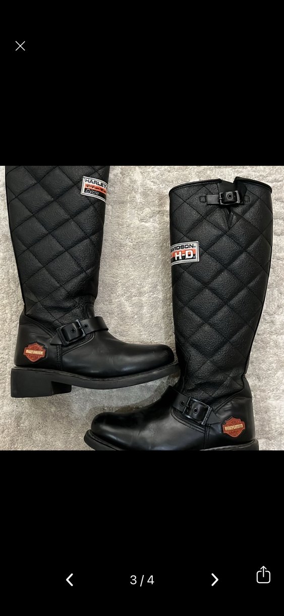 Kadınlar için siyah deri, desenli, tokalı biker dizüstü çizme. Blok topuklu ve Harley-Davidson amblemli, rock punk sokak stiline uygun.