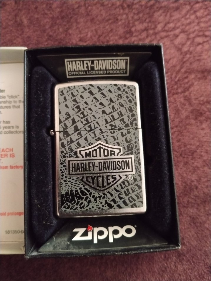 Orijinal kutusunda, detaylı desenli ve resmi Harley-Davidson logosuna sahip gri Zippo çakmak. Vintage biker tarzını yansıtıyor.hiç kullanılmamıştır.
