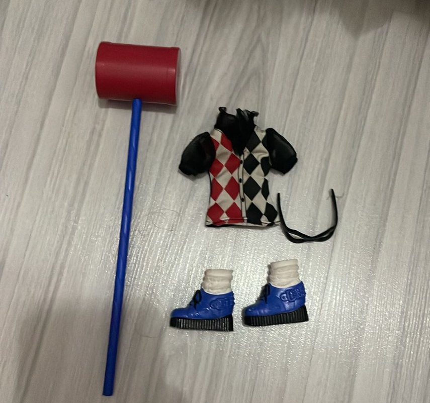 Bu set, renkli plastik bir tokmak, cırt cırtlı kravat desenli gömlek, mavi ayakkabılar ve siyah gözlükler içerir. Hayal gücü oyunları için uygundur.