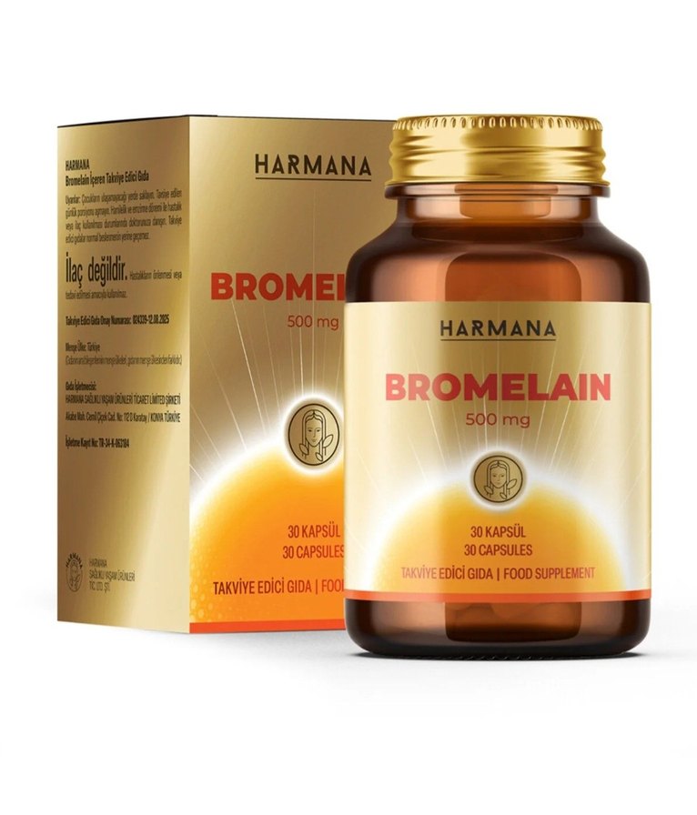 Harmana Bromelain 500 mg içeren, 30 kapsüllük besin takviyesi paketi. Her kapsül parlak kahverengi renktedir. HARMANA Bromelain 500 mg Takviye Edici Gida 30 Kapsül