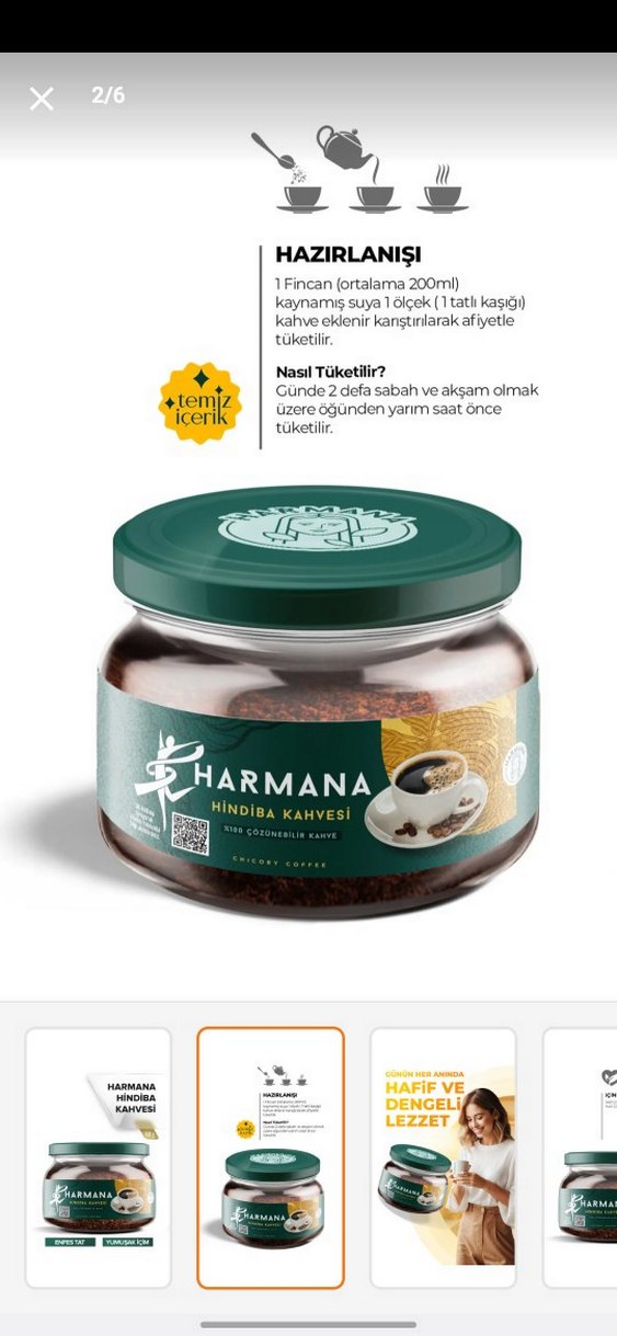 Harmana Hindiba Kahvesi 200ml kavanozda sunulur. 1 tatlı kaşığı kaynamış suyla karıştırılarak hazırlanır. Günde iki defa, sabah ve akşam, öğünden yarım saat önce tüketilir. ☕