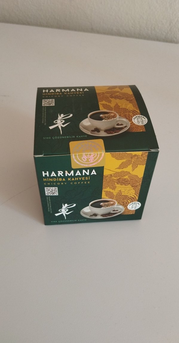 Harmana hindiba kahvesi, koyu kahverengi seramik kutuda sunulmuştur. Ambalajda marka adı net bir şekilde yer alır. ☕