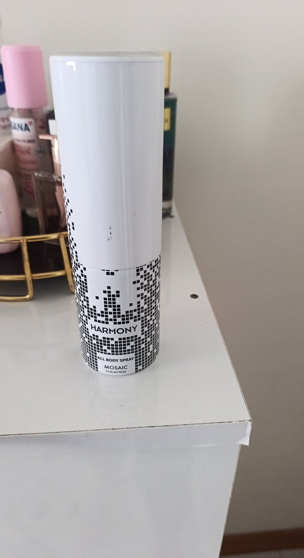 Harmony Mosaic kadınlar için ferahlatıcı koku sunan tüm vücut spreyidir. Beyaz ve siyah mozaik desenli şişeye sahiptir.