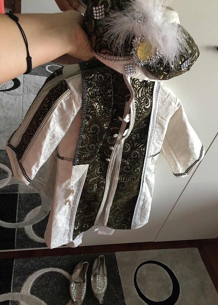1 numara harput sünnet kıyafeti. Oğlum 4 yaşında giydi .onun dışında iki oğlumuz daha giydi . Ürün durumu fotoğraflardaki gibi , çarıkların birinin ponponunda dağılma var. Kaftanı, yeleği , gömleği , kuşağı pantolonu , şapkası ,çarıkları mevcuttur . Sadece kılıcı yoktur . Kaftanın 5. resmine ve yelek resimlerine dikkatli bakın, taşlarının içinde siyahlık var düşmüş gibi sonradan mı oldu bilemedim sonradan dikkatimi çekti açıklamaya yazıyorum .Giyecek olan oğlumuza hayırlı olsun