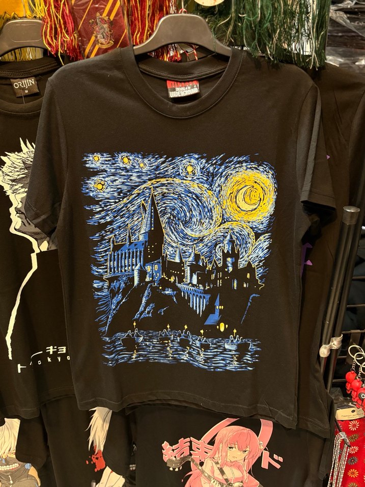 Bedenler mevcut siyah renkli, bol kesim, kısa kollu ve yuvarlak yakalı tişört. Sentetik kumaş üzerinde gotik tarzda baskı bulunur.