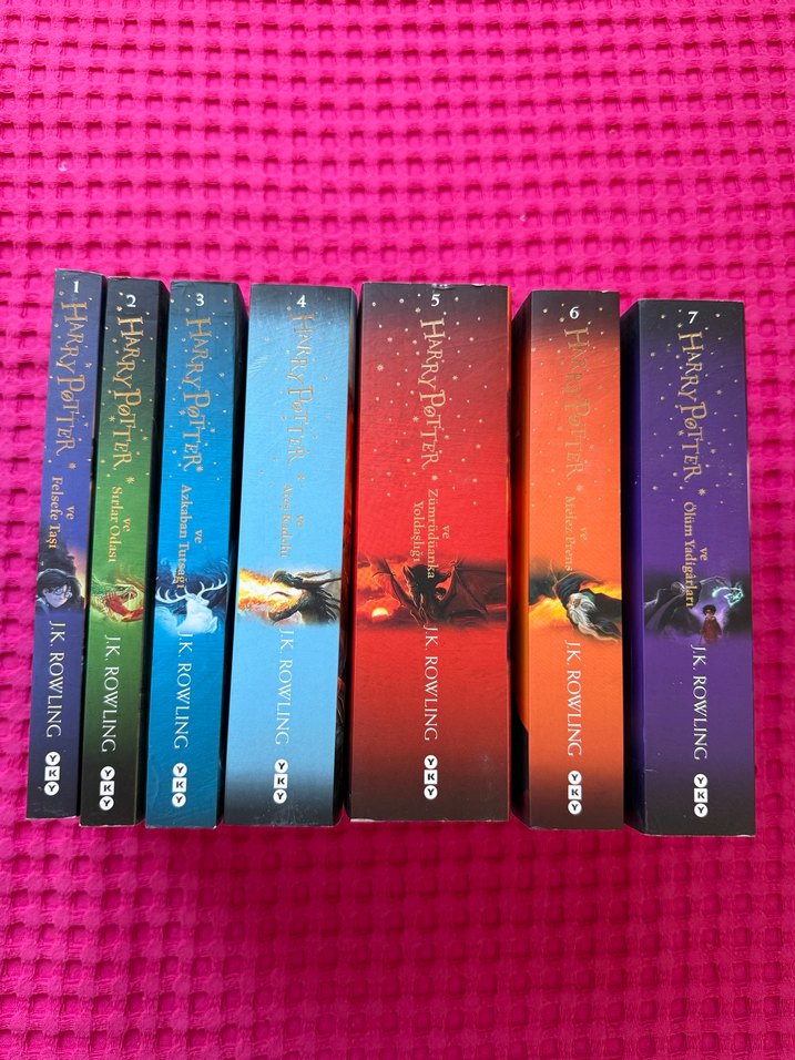 J.K. Rowling'in renkli ve illüstrasyonlu sırt kapaklarına sahip yedi Harry Potter kitabı seti. *sıfır ayarında Komple set
