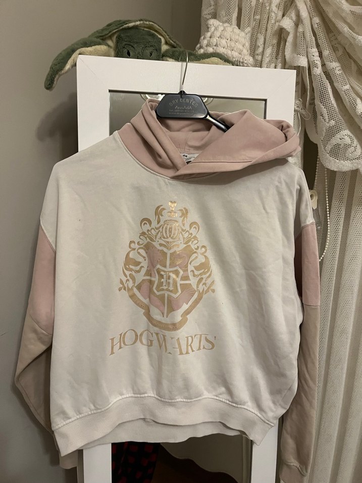 Uzun kollu, kapşonlu ve bol kesim kız sweatshirtü. Ve pantolonu Yumuşak pudra tonlarında. Önünde Hogwarts baskısı bulunur. 12-14 yaş