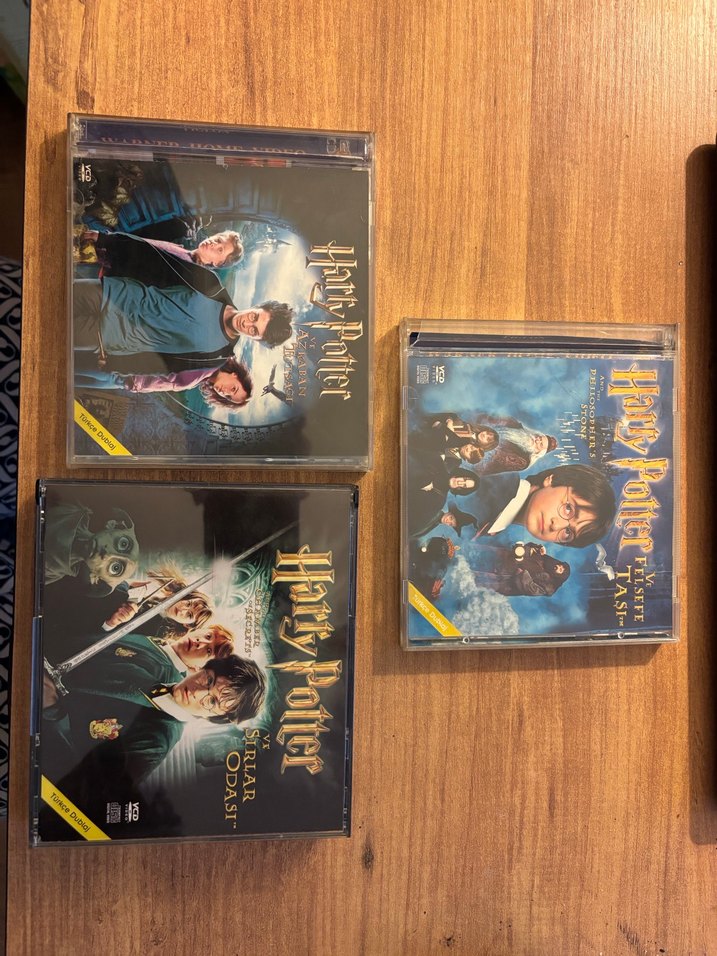 Harry Potter 3 filmden oluşan VCD seti. Kapaklardan biri kırık, VCD’ler bandrollü ve çalışır durumda