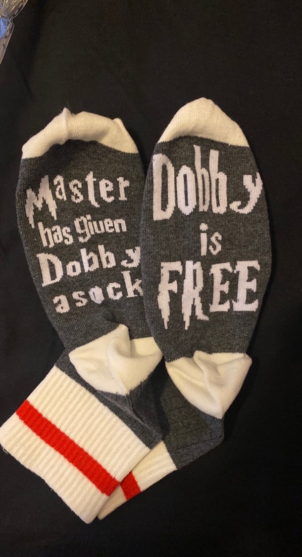 Harry potter dobby is free çorap. Yurtdışından alınmıştır. Gri renkli malzemeden yapılmış unisex çorap.Baskılı yazılar ve kırmızı çizgili ribanalı manşetleri vardır. Yumuşak ve sıcak tutar.